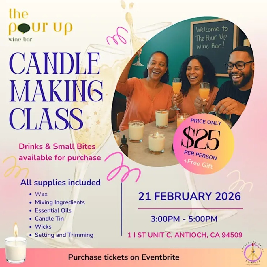 Join us for a fun, relaxing, and creative Candle Making Class at the beautiful waterfront Pour Up Wine Bar in Antioch. During the class, you’ll learn the basics of candle making while creating your own custom-scented candle to take home. All supplies are included, so just bring yourself and your good vibes. REGISTER BY CLICKING HERE