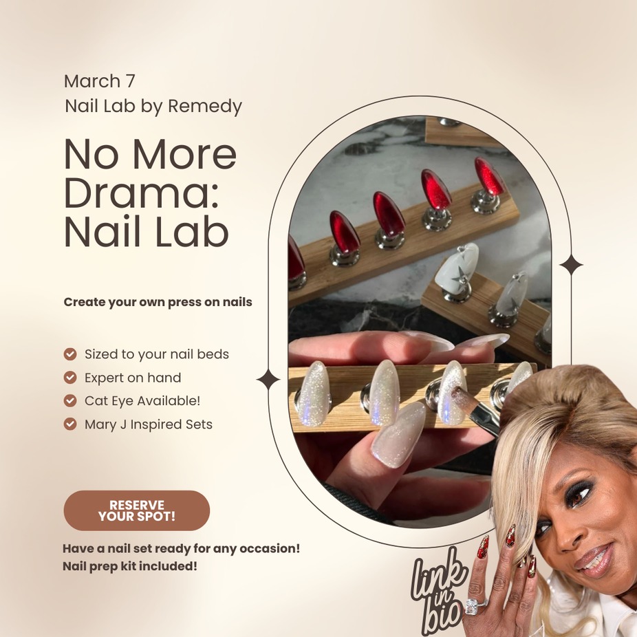 Sing along to all the Mary J Blige hits while creating your own press on nails! Choose your sizes and get to work. CLICK HERE TO RESERVE